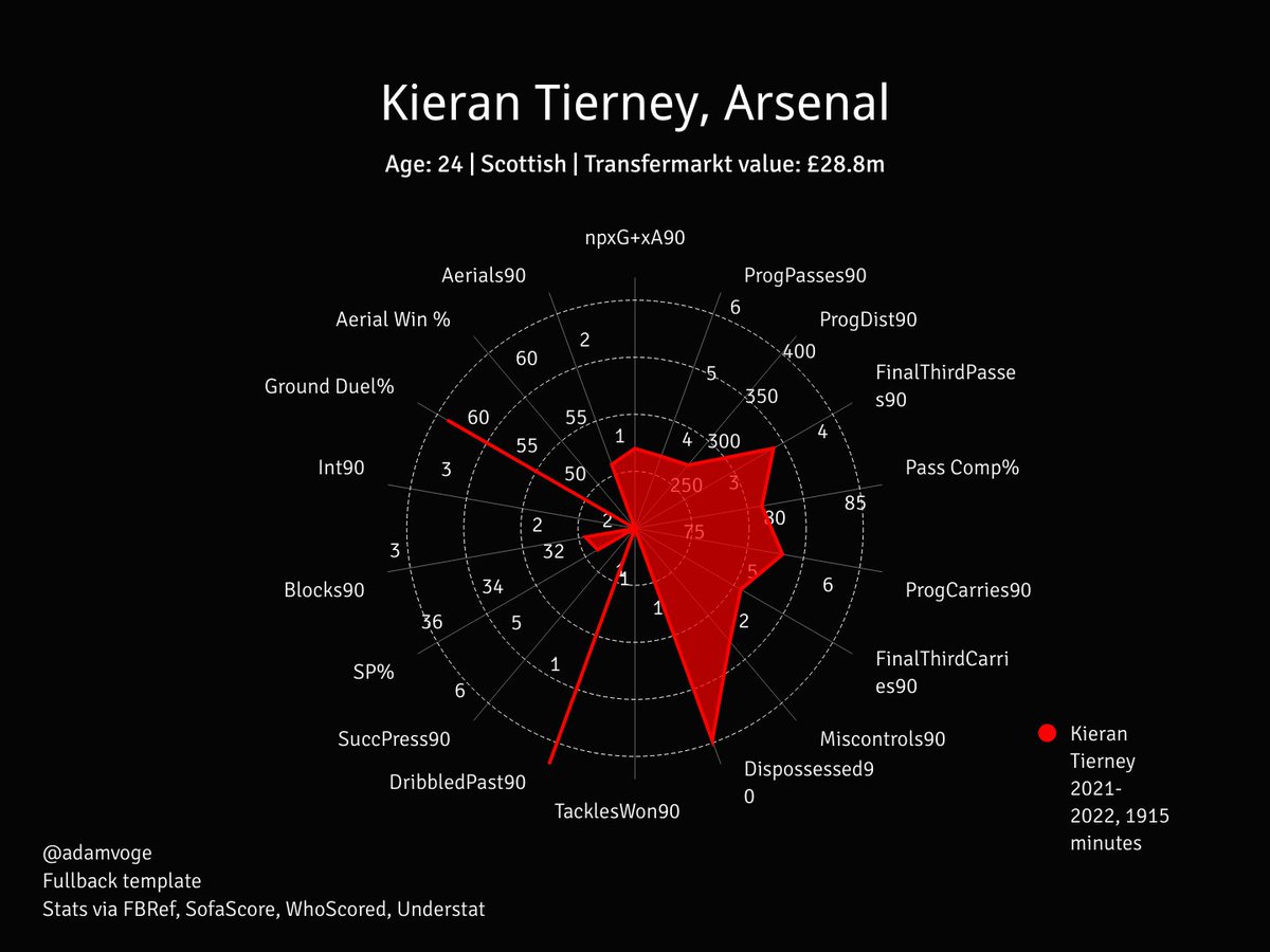 Into the fullback spots. Kieran Tierney's never been one to rack up tackles and pressures, but he was pretty consistent this season at keeping the ball and keeping his man in front of him. Arsenal will need the Scot to stay healthy (for once) if CL next season is the plan.