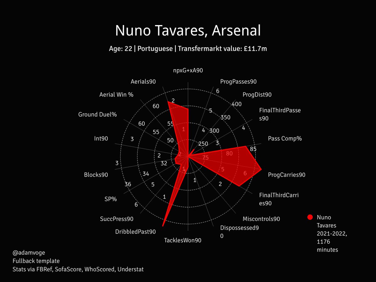 Lastly, here's Nuno Tavares. This chart is pretty appropriate for the roller-coaster LB/LWB, with very good ball carrying numbers and some others, with very bad ball control and defending numbers. He's a wild ride, and we'll see what happens next season.