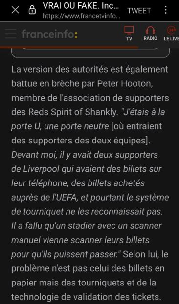 J'en veux pour preuve le témoignage de Robertson, le joueur de Liverpool, qui a offert des billets officiels à des proches. Une fois aux tourniquets, on a dit à ses proches que ces billets seraient des faux.