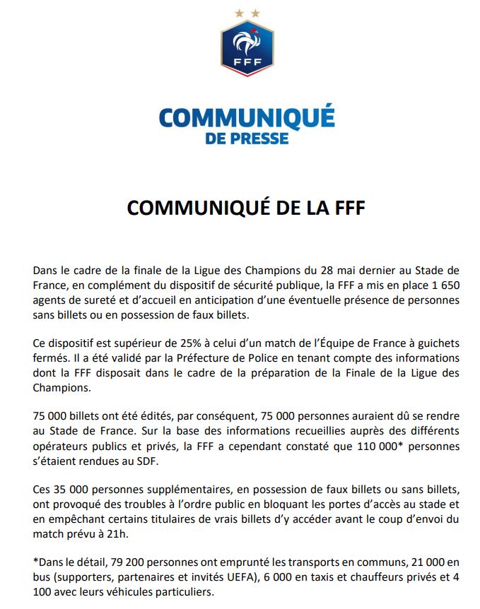 Raccourci ou mensonge (volontaire ?) de la FFF qui fait exprès d'assimiler les habitants du coin et les milliers de Madrilènes de la Fan Zone à des "ersonnes supplémentaires, en possession de faux billets ou sans billets [qui] ont provoqué des troubles à l’ordre public".