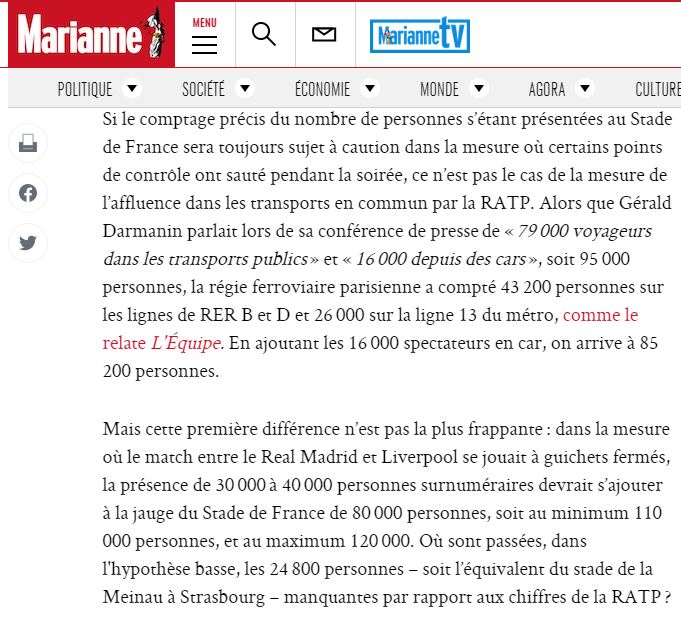 Etant rappelé que le prétexte initial était le prétendu retard des supporters de Liverpool. Prétexte rapidement abandonné puisque les vidéos sur les réseaux sociaux montraient des points de pré-filtrage déjà congestionnés plus de 3h avant le coup d'envoi.