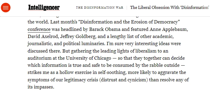 ‘If only the best minds, the most credentialed experts, could be given new authority to regulate the flow of “#fakenews”, the scales would fall from the eyes of the people and they would re-embrace the old order they had been tricked into despising.’ nymag.com/intelligencer/…