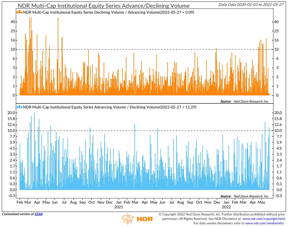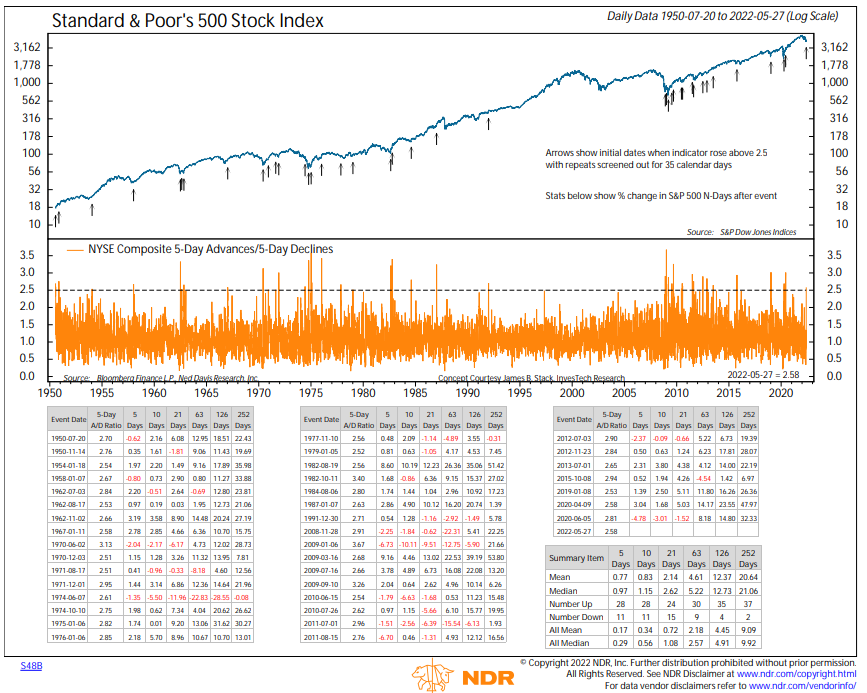 2. Friday was a 11:1 up day based on our database of common stocks. That follows one on May 13, but because May 18 was a 10:1 down day, another 10:1 up day is needed for a double 10:1 breadth thrust signal. (w/o a 10:1 down day in between). 2/5