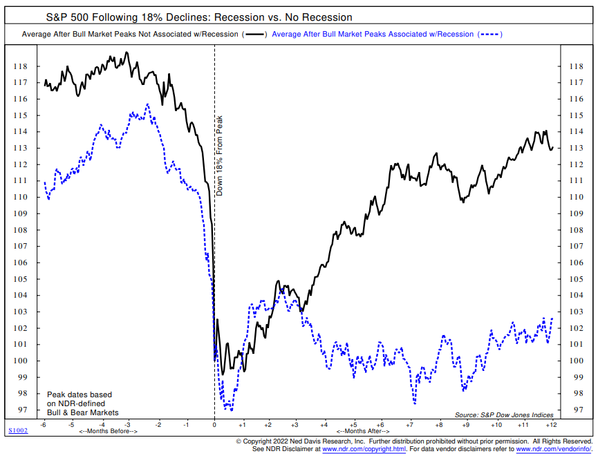 4. The $SPX has priced in a slowdown but not a recession. At first, 18% declines that overlap with recessions look like those that don't overlap. If no recession, a sustainable rally *should* start soon. If not, a few more tough quarters could lie ahead.