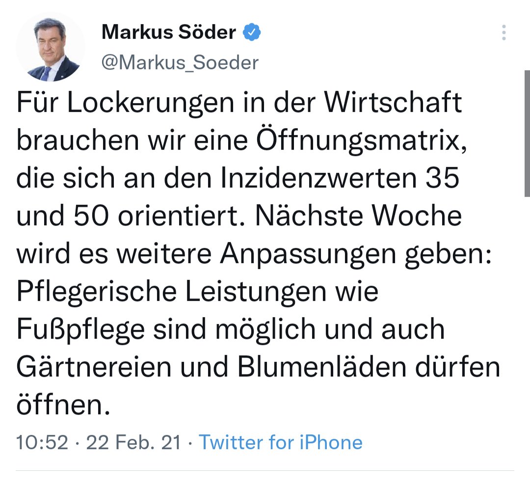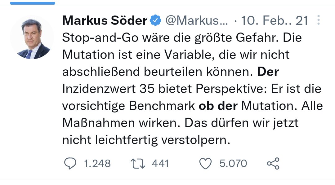 Alle Maßnahmen wirken. Das dürfen wir nicht leichtfertig verstolpern. Stop-and-Go wäre die größte Gefahr. Der Inzidenzwert 500 ist die vorsichtige Benchmark ob der Mutation.