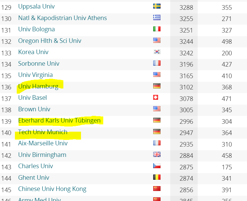 Irgendwo auf Platz 62 hält sich Heidelberg tapfer, dann folgt die LMU München (Großhadern) auf respektablem Platz 82....