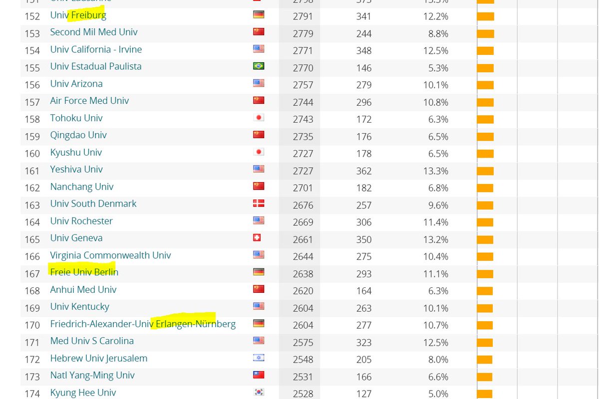 Es folgen, schon abgeschlagen, Freiburg, FU Berlin (2003 zur Charité hinzugekommen) und Erlangen ...