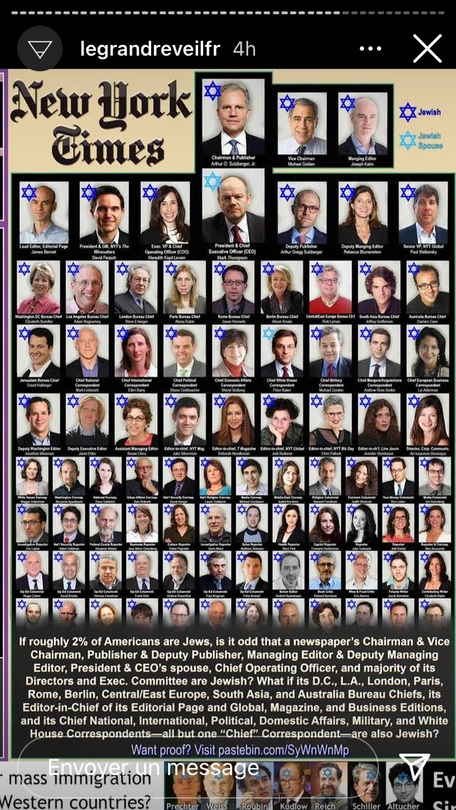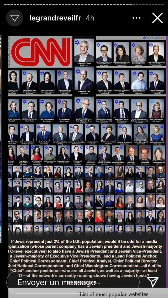 Depuis le début du Covid, tous les gens qui suivent sérieusement la désinfo n'ont pas pu louper "Le Grand Réveil". Un média principalement actif sur Instagram et Telegram, avec des publications comme celles-ci : des listes des juifs qui bossent à CNN et au NYT
