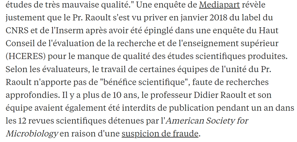 Sans conteste, le processus décrit ci-dessus, et dont on a tant parlé, est bien plus transparent, solide que celui qui a permis à Raoult de dire qu'il fallait prescrire l'HCQ pour le Covid. Voir cet article en accès libre du Parisien : leparisien.fr/societe/irresp…