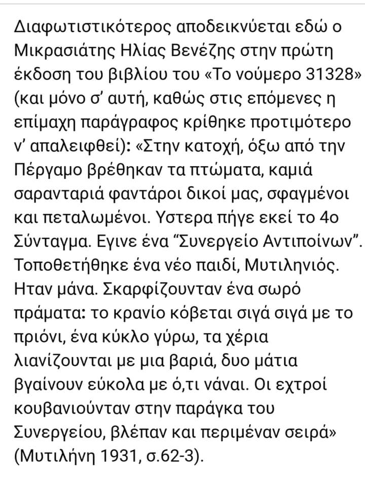 1)Το παρακάτω απόσπασμα είναι αληθινή μαρτυρία απο το βιβλίο "31328" του Ηλία Βενέζη. Η συγκεκριμένη παράγραφος περιλήφθηκε μόνο στην 1η έκδοση του Βιβλιου (1924) γιατι μετά έπεσε....