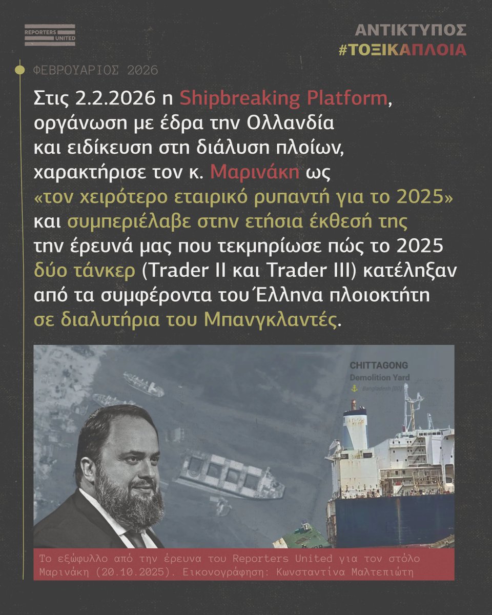 2⃣ Στις 2.2.2026 η Shipbreaking Platform, οργάνωση με έδρα την Ολλανδία και ειδίκευση στη διάλυση πλοίων, χαρακτήρισε τον κ. #Μαρινάκη ως «τον χειρότερο εταιρικό ρυπαντή για το 2025» και συμπεριέλαβε στην ετήσια έκθεσή της την έρευνά μας που τεκμηρίωσε πώς το 2025 δύο τάνκερ (Trader II και Trader III) κατέληξαν από τα συμφέροντα του Έλληνα πλοιοκτήτη σε #διαλυτήρια του #Μπανγκλαντές.