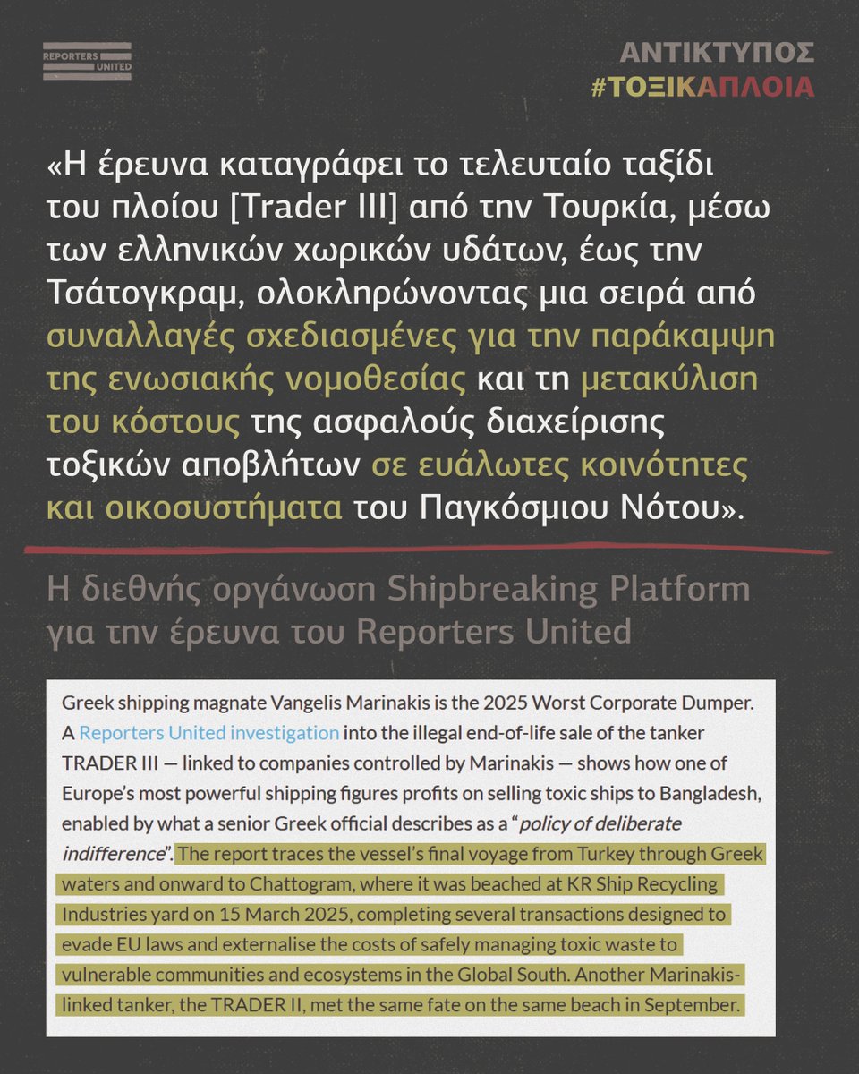 3⃣ «Η έρευνα καταγράφει το τελευταίο ταξίδι του πλοίου [Trader III] από την Τουρκία, μέσω των ελληνικών χωρικών υδάτων, έως την #Τσάτογκραμ, ολοκληρώνοντας μια σειρά από συναλλαγές σχεδιασμένες για την παράκαμψη της ενωσιακής νομοθεσίας και τη μετακύλιση του κόστους της ασφαλούς διαχείρισης τοξικών αποβλήτων σε ευάλωτες κοινότητες και οικοσυστήματα του Παγκόσμιου Νότου», ανέφερε η διεθνής οργάνωση #ShipbreakingPlatform για την έρευνα του #ReportersUnited.
