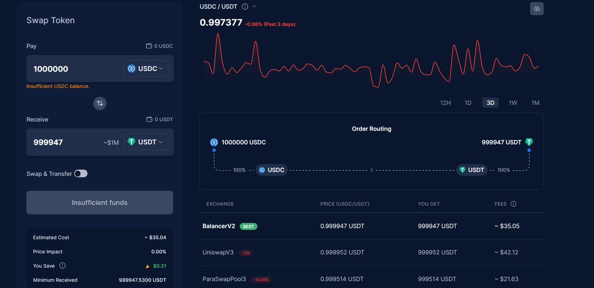 2/ Cleaner mechanisms + cheaper fees: BAL stable swaps are more efficient than Curve esp under $1m swaps. We expect this to extend as the pool deepens with more liquidity.