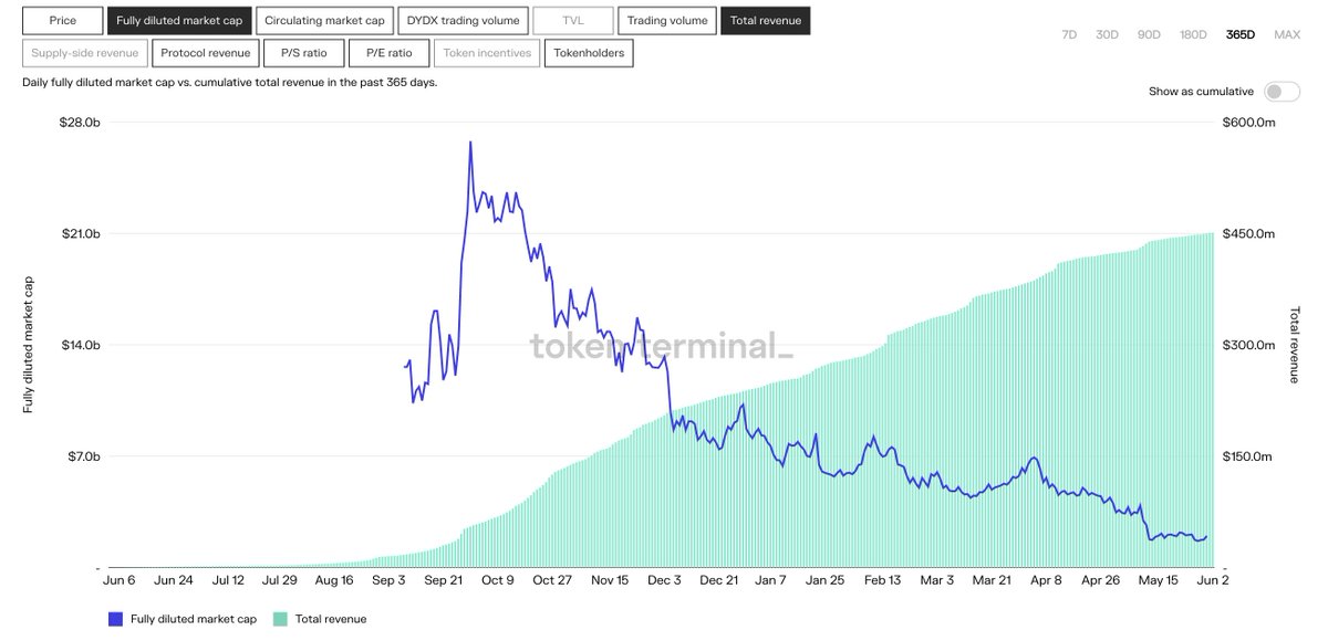 When you look at their Total revenue (cumulative) vs the P/S ratio you can get an idea on just how much #dydx holders could stand to gain if these rewards were to be turned on.