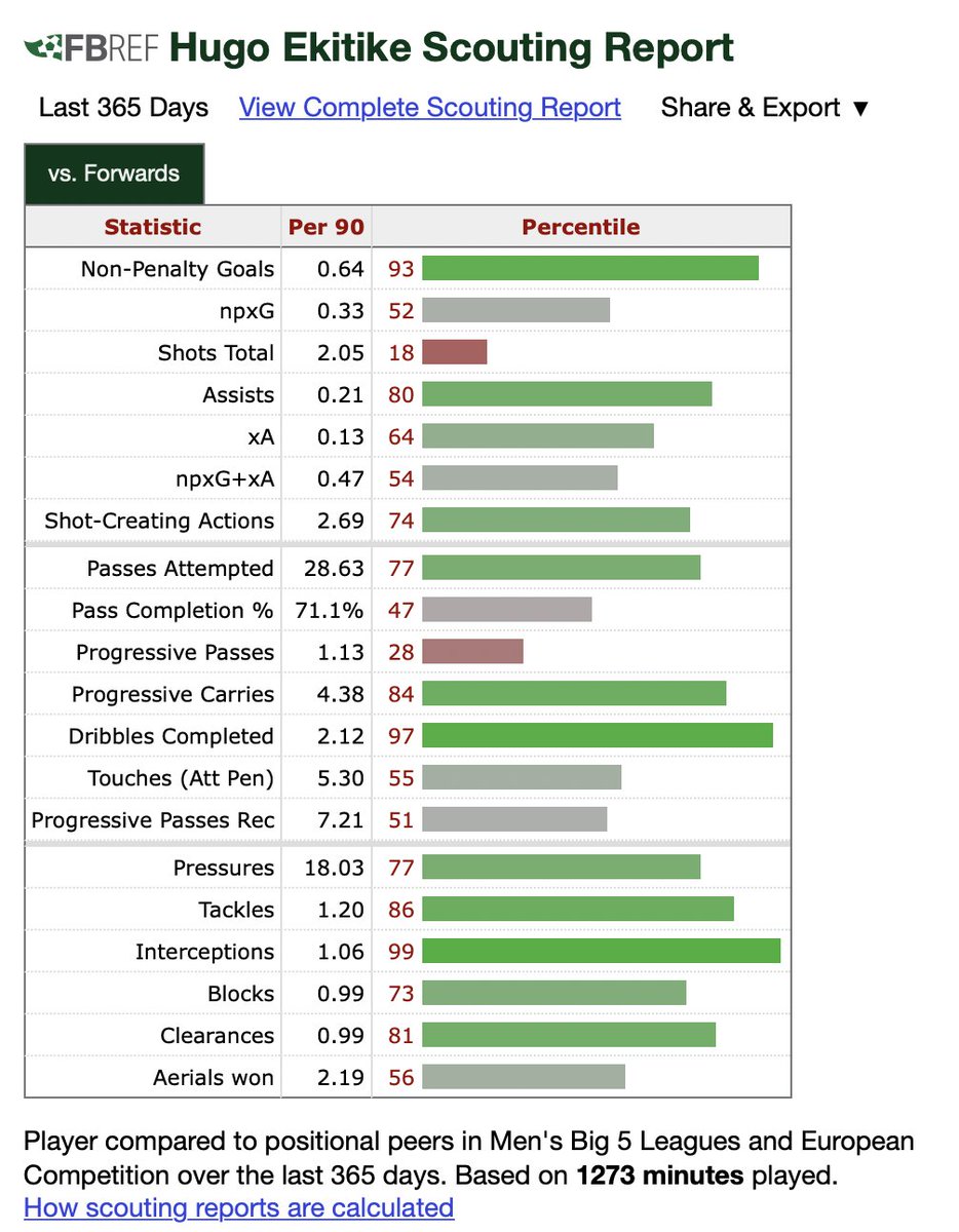 Last season was Ekitike’s break out season, this is the first season he has recorded over 1000 mins and has given a good indication of his current ability and the wealth of potential he possesses. Player info below: