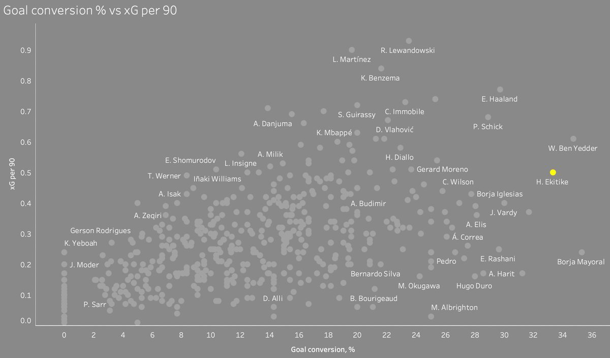His ball-striking is exceptional, another real strength of Ekitike’s. He can shoot with a good variety mixing it up with controlled, power and finesse shots using which he deems the situation requires. His shooting is consistently good out of the dribble, as well as first-time.