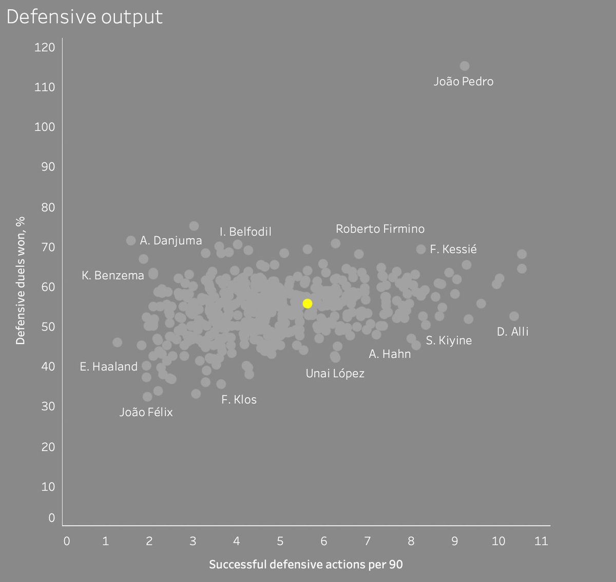 Surprisingly for many, DG came out on top for successful defensive actions per 90. This is perhaps due to the bias of fans to see BW throwing himself and being committed in duels to skew their impression of defence. DG quietly was more effective in his actions be it marginally.