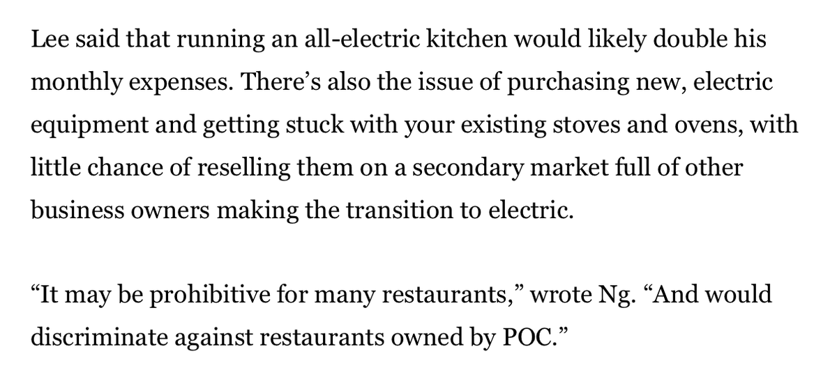 The piece concludes with a long quote from a chef worrying that it will cost him an arm and a leg to replace his gas stove with an electric one. Kind of weird, considering that literally no one is asking or requiring him to do that!