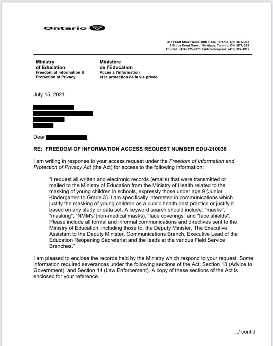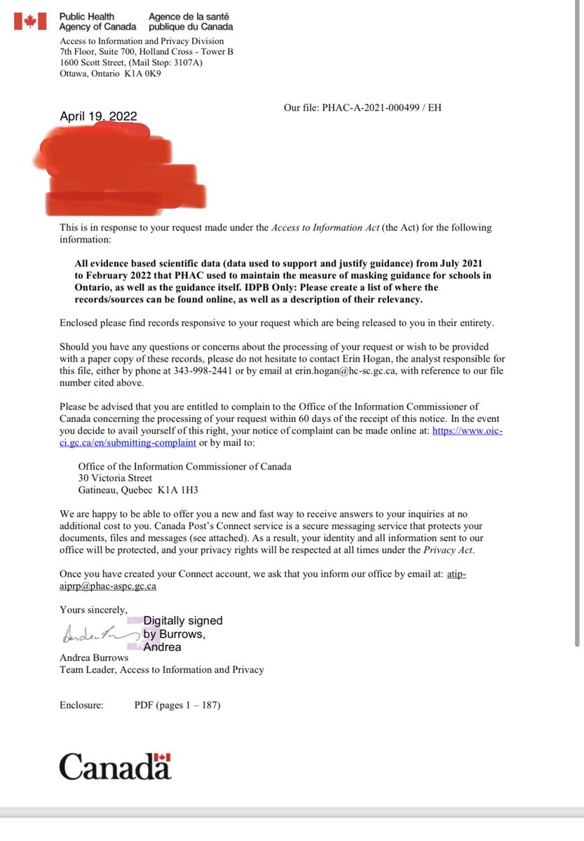 1/ I have obtained a FOIA response from the Public Health Agency of Canada regarding a request for all evidence based scientific data used to inform and guide public policy around masking in schools.