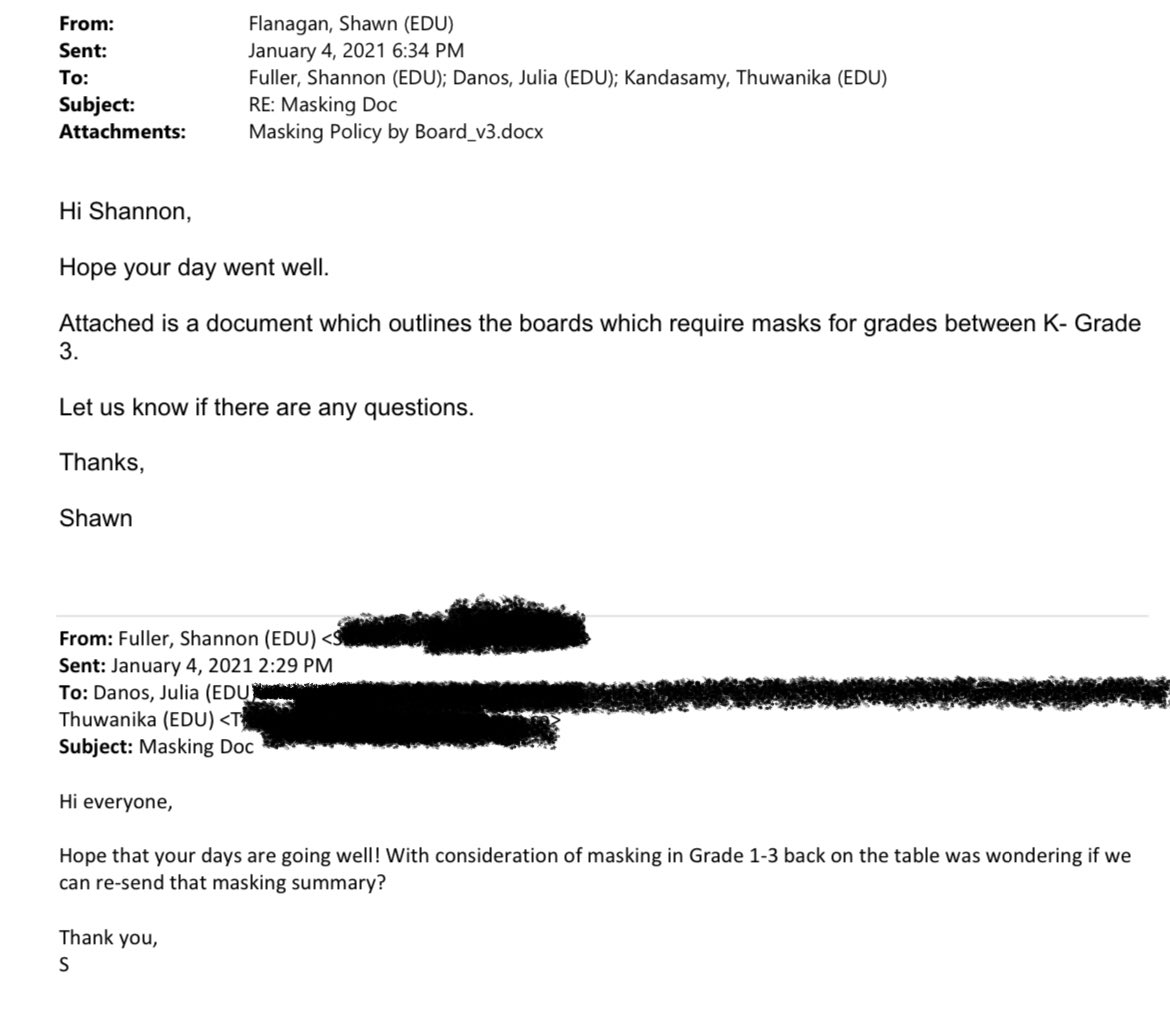 Over 140pgs of email correspondence between the Ministry of Health and the Ministry of Education regarding decision to mask K-Gr 3.