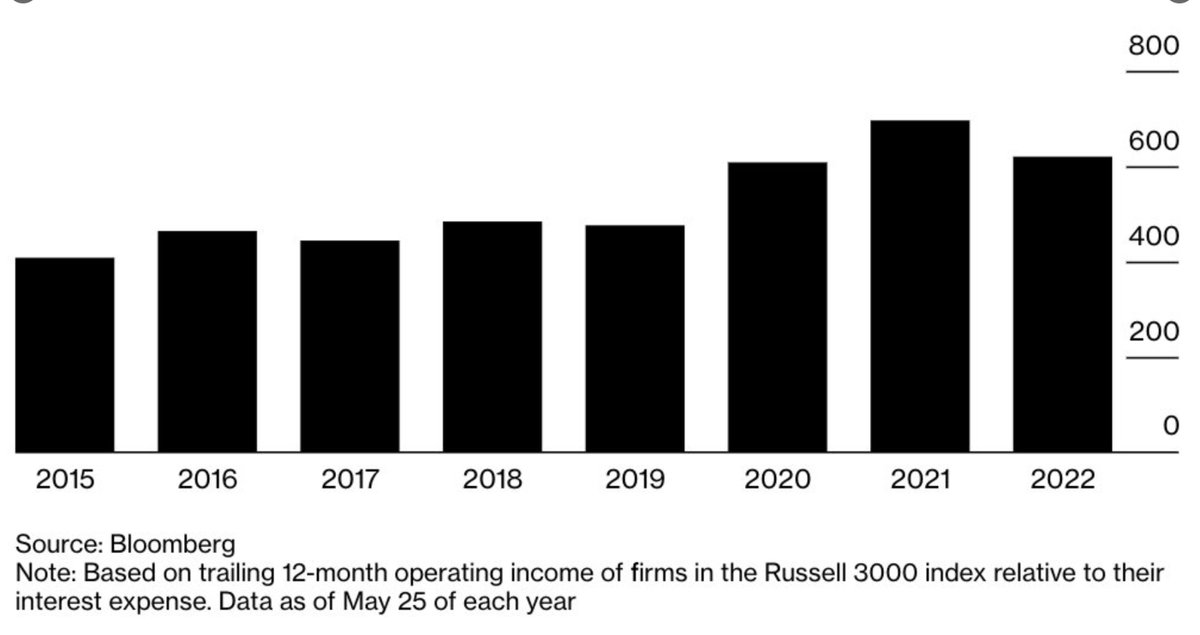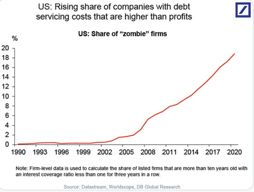 This is why we’ve seen an increasing amount of zombie companies. Roughly 25% of the companies in the Russell 3000, for example, are zombie companies.