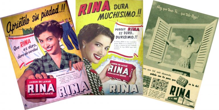 ...adquirir las pastillas olorosas de Rina. Consuelito Vidal, que era la imagen de la marca, llegaba a todos los hogares cubanos a diario a través de la radio y la televisión con la frase: "¡Esa casa que usted está deseando, pídala con fe para que Rina se la dé!".