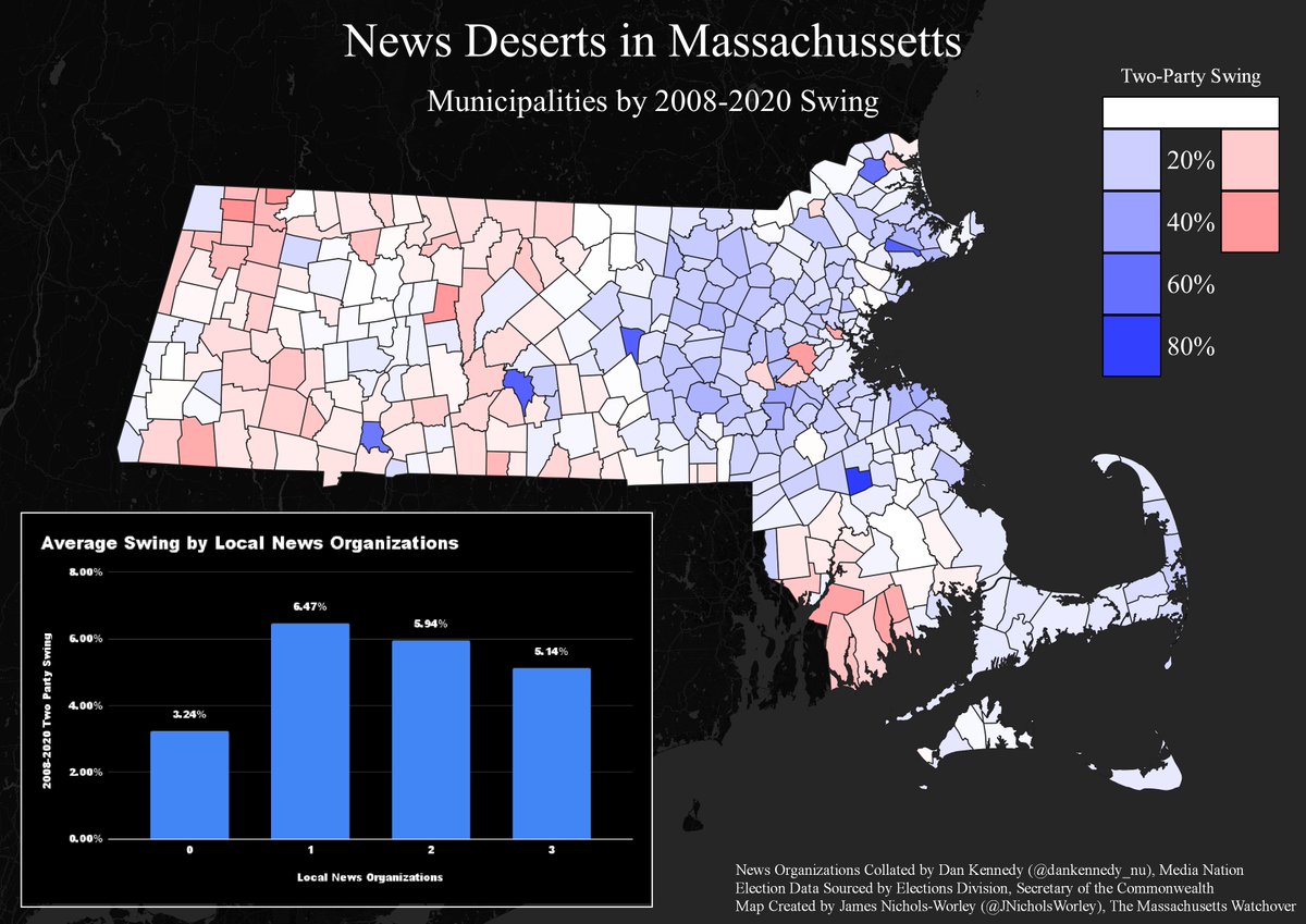 Probably not shocking, but municipalities without any local news organizations saw a smaller swing, relative to the state, between 2008-2020. Correlation ≠ Causation, but it's interesting to note. #mapoli