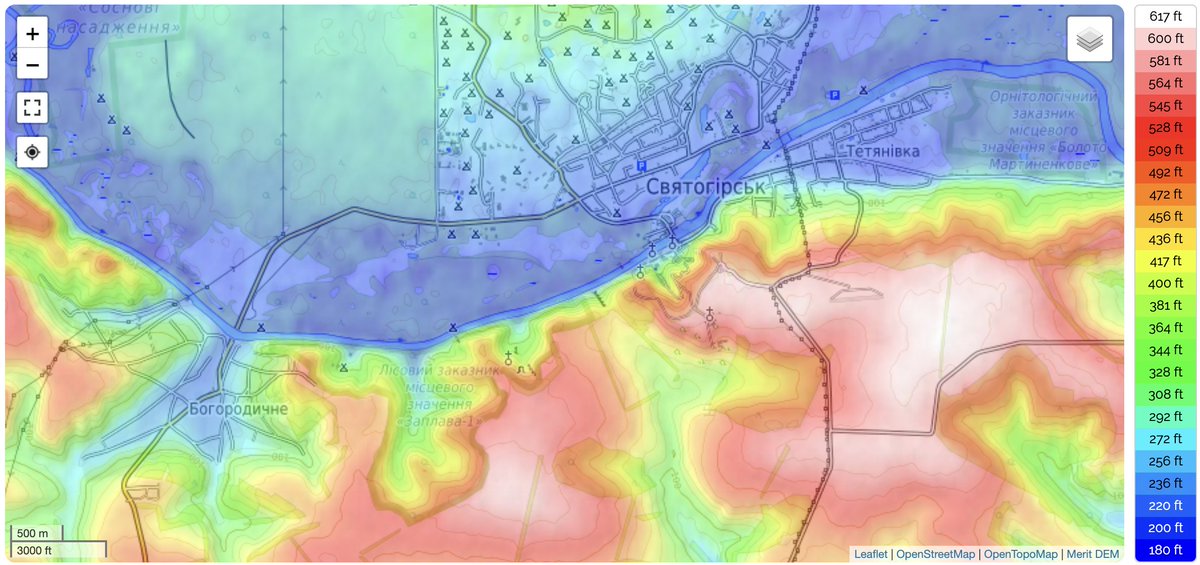 14/ Reports in the last two days suggest that the Russians have crossed the river again near Bohorodychne and Tetyanivka across from Sviatohirsk. This is potentially dangerous for the Ukrainians, though they almost certainly still control the high ground behind the two towns.