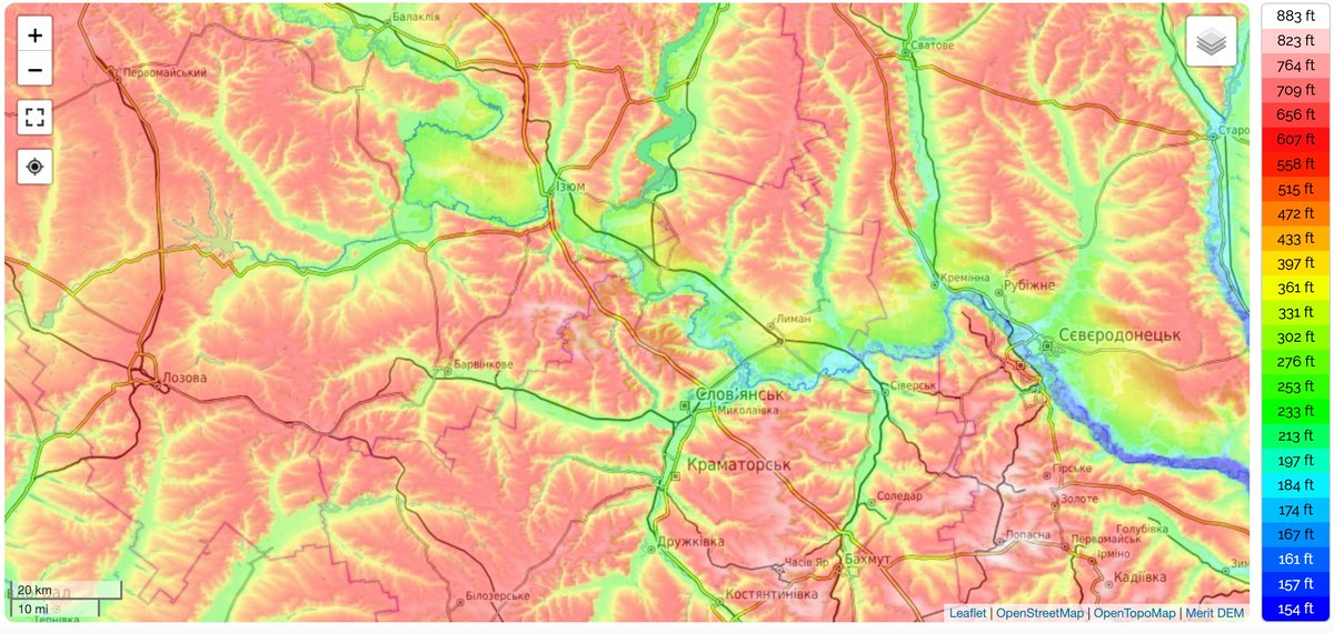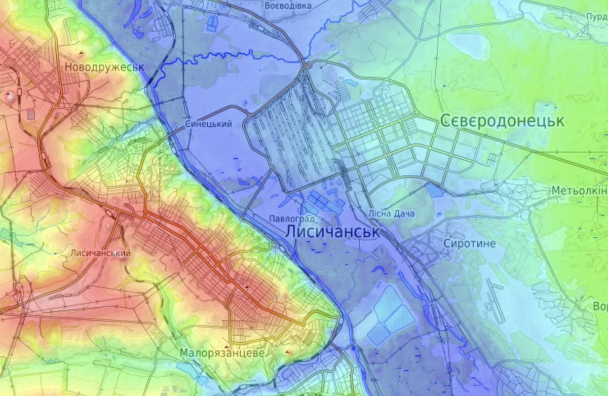 16/ The same factor - control of the high ground - likely also means that the loss of Sievierodonetsk wouldn't be nearly as serious as the loss of Lysychansk, which overlooks the river valley from the high ground opposite Sievierodonetsk.