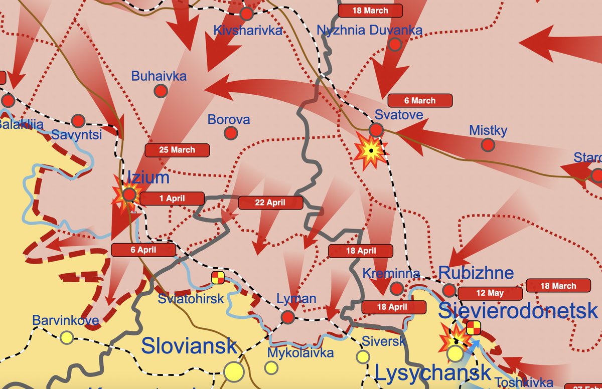 13/ Crossing the Siverskyi Donets has been a high priority for Russia as an essential step towards encircling Ukraine's forces in the Donbas. They crossed the river at Izyum in early April but so far haven't been able to advance much further on that axis.