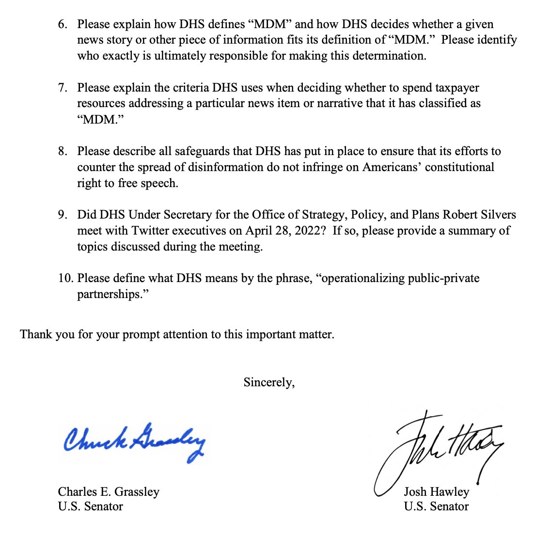 “The 1A of the Constitution was designed precisely so that the government could not censor opposing viewpoints – even if those viewpoints were false. DHS should not in any way seek to enlist the private sector to curb or silence opposing viewpoints." hawley.senate.gov/hawley-grassle…
