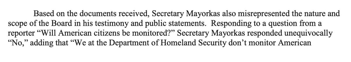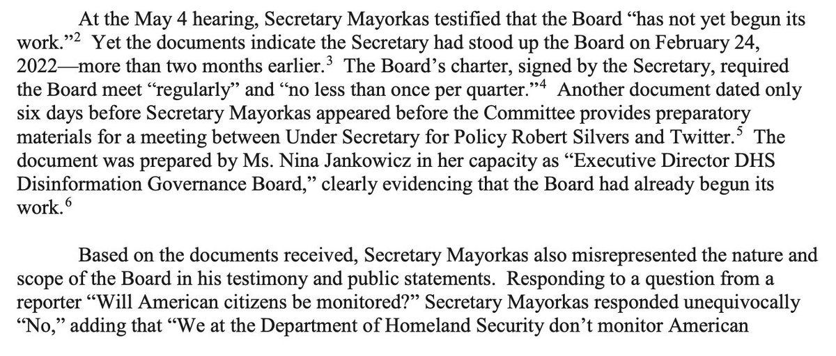 "At the May 4 hearing, Secretary Mayorkas testified that the Board 'has not yet begun its work.' Yet the documents indicate the Secretary had stood up the Board on February 24, 2022—more than two months earlier."