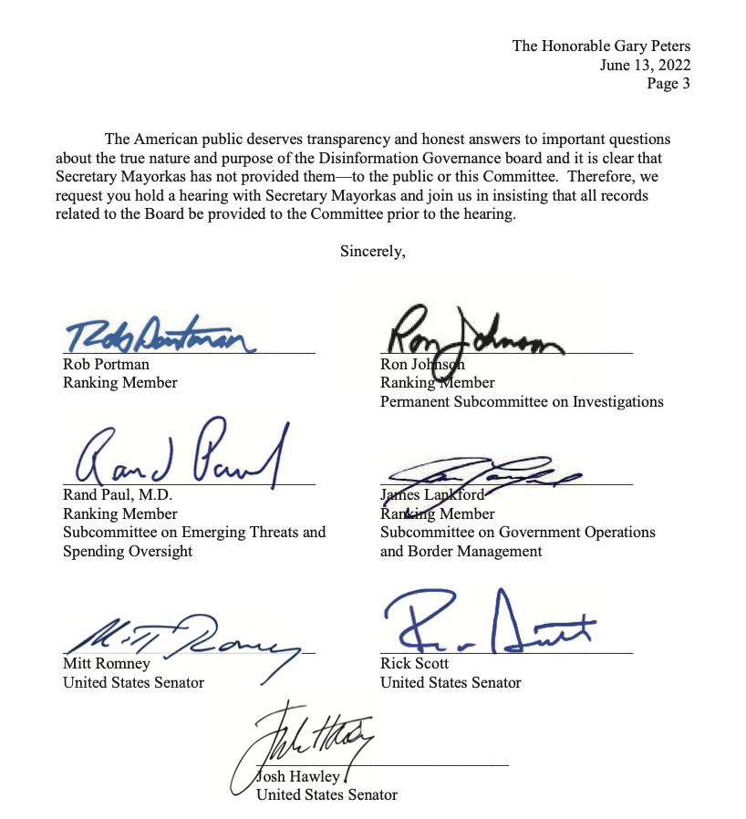 "The American public deserves transparency and honest answers to important questions about the true nature & purpose of the Disinformation Governance Board & it is clear that Secretary Mayorkas has not provided them—to the public or this Committee."