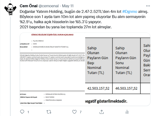#Dgnmo, geçen haftaki 100k lottan sonra dün de 100k lot geri alım yapmış.