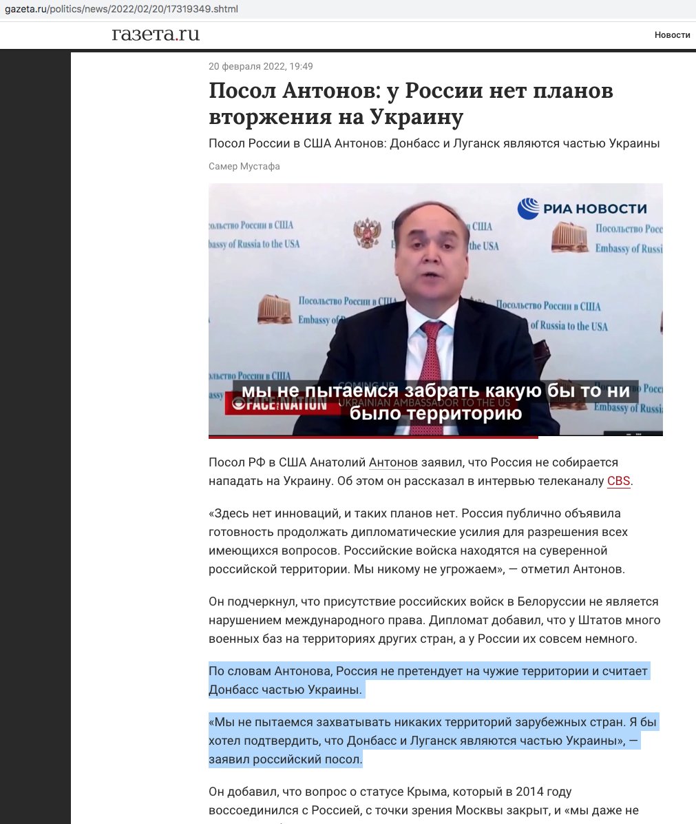 On 20th Feb 2022, 4 days before invasion, Russian ambassador to the US Antonov said, Russia recognises Donbas as a part of Ukraine, does not have any claims on Ukrainian lands, does not have plans of any attack and considers the Crimea issue closed. /8