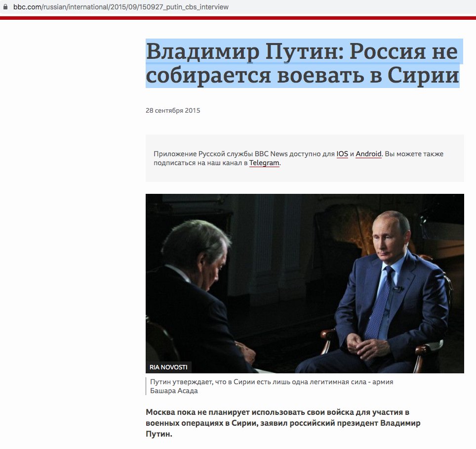 On Sept 28th 2015, Putin said in his interview to BBC, Russia has no plans to get involved in war in Syria /10