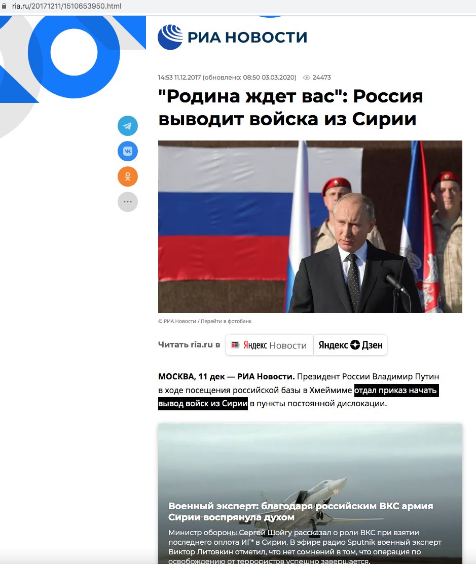 Of course, he lied and sent his troops to Syria. In 2 years, on Dec 11th 2017, Putin said, Russian troops have fulfilled their mission in Syria, and gave an order to return his troops to Russia. He lied again, Russian troops are still present and fighting in Syria /11