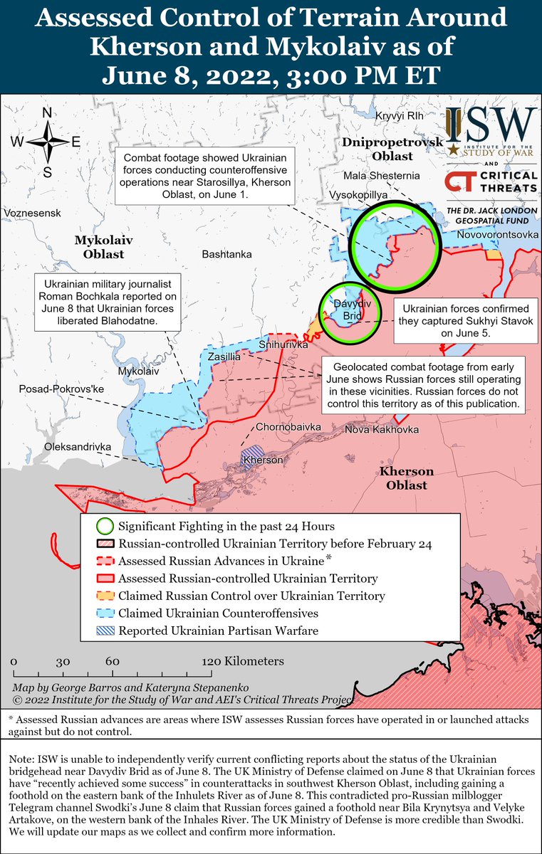 4. En el frente Este, las fuerzas rusas han llegado y controlaría la mayor parte de la orilla del río Donets (azul) que hace de un parapeto muy eficaz para retenerlos. La duda es si tratarán de cruzarlo en uno o varios puntos a la vez que empujan por la zonas donde no hay ríos.