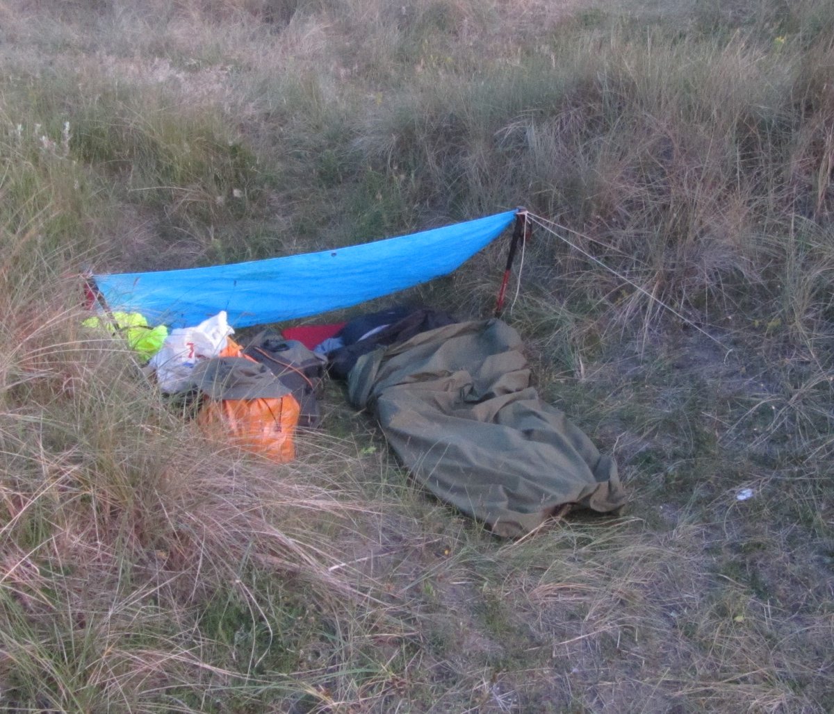 My first camp is a ramshackle affair: army surplus bivvy bag; plastic sheet found in the shed; a trekking pole held with string.