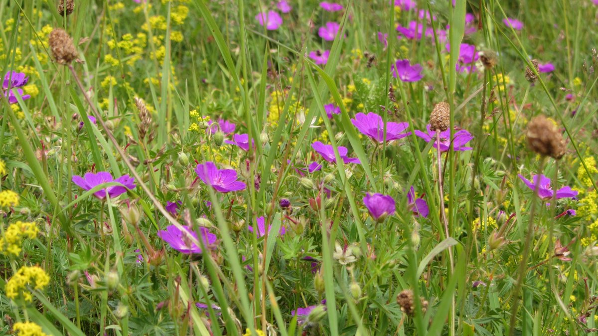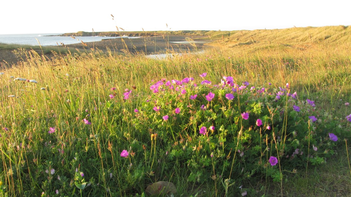 Northumberland's county flower 'Bloody Cranebill' shouts out from the marram grass, glowing in the morning rays.