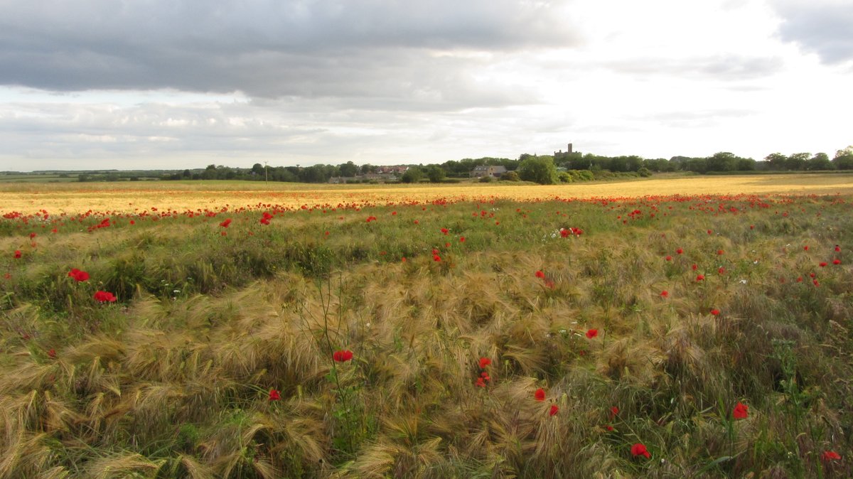 Warkworth Castle makes an impressive backdrop on the horizon before a field of red poppies. The scene is a landscape version of the WW1 memorial: 'Blood Swept Lands and Seas of Red'.