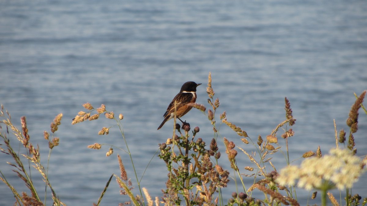 A smart male stonechat, in full breeding plumage, perches on a thistle a few feet away. He flicks his short tail impatiently whilst voicing his hallmark sound: two pebbles sticking together.