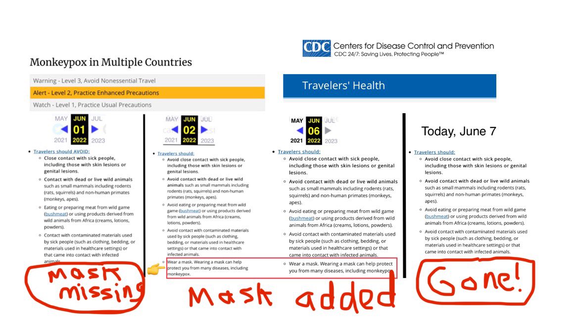 ⚠️HOLY MOTHER OF HELL—what the hell is this muzzling shit @CDCgov? Recently, CDC upgraded ⬆️travel advisory on #Monkeypox to Level 2 & then adding “Wear a mask” after initially forgetting to add it. But just today, it has backtracked again & DELETED “wear a mask”—@CDCDirector?!🧵