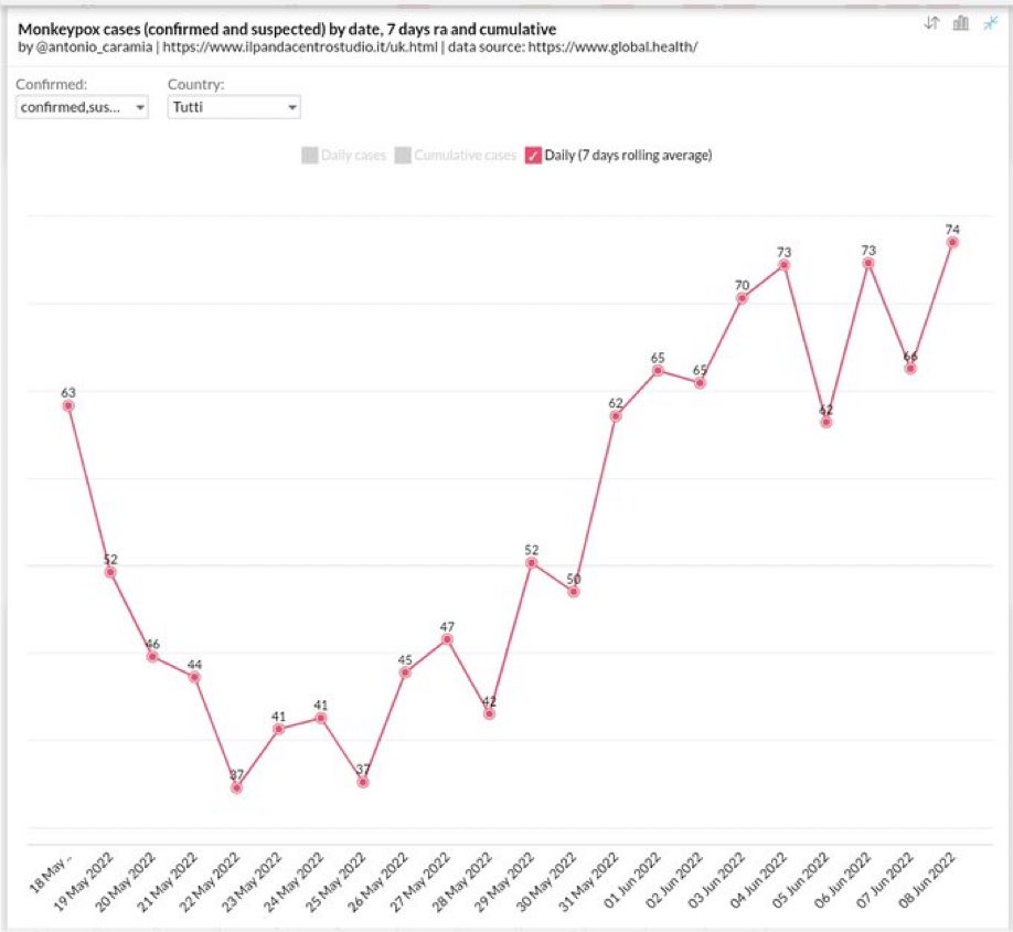 📍NEW RECORD—Today, the world just set a new 7-day average record of +74 new #monkeypox cases per day. England 🏴 is now the leader in over 300 cases identified to date. Guess being an island & Brexiting from the EU didn’t help UK 🇬🇧 much under Boris Johnson.