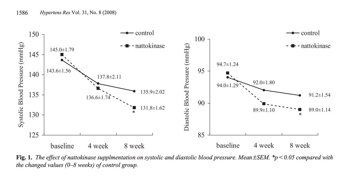 This RCT examined the effects of NK on blood pressure. Unlike the above 2021 study which showed no effect on BP, here, NK induced a statistically significant decrease in BP after only several weeks on 2000 FU NK daily.