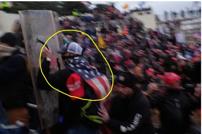 At 3:59 mark, that’s Dom Pezzola of New York. Accused of being Proud Boy & smashing open window with police riot shield. Not guilty plea in seditious conspiracy case. Been in DC jail more than a year. Argued for release, including saying there’s lack of hygiene in jail