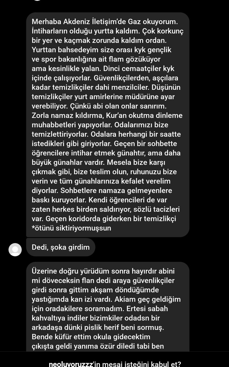 Ve hepsini geçtim.. Bu kadar intiharlar olmuş. Ve ne rektör, ne yurt sorumlusu ve ne de bölgedeki milletvekilleri konuyla ilgili açıklama yapmış ne sorulan sorulara cevaplar vermiş. Üstüne üstlük habere yayın yasağı gelmiş ve cinsel istismar konuşuluyor..