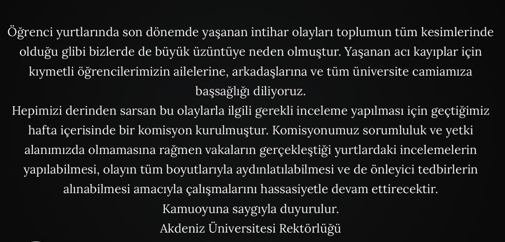 Tarihler 11 Mayıs 2022 yine Akdeniz Üniversitesi içinde bulunan Elmalılı Hamdi Yazır KYK Yurdu'nda ikamet eden ve üniversitede öğrenim gören bir öğrenci daha intihar etti.. Tek bir açıklama dahi yok..