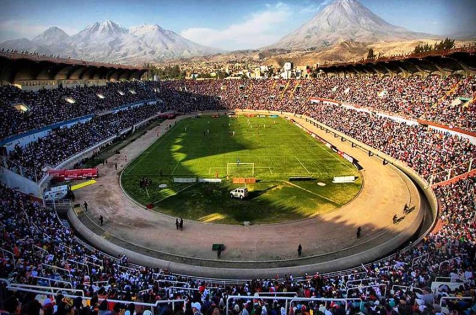 7. Estádio de la UNSA: a magnificência do ambiente impressiona. Está localizado no departamento de Arequipa, no Peru, e tem capacidade para mais de 60.000 espectadores. No fundo está o vulcão Misti, um dos dez vulcões ativos da Cordilheira dos Andes.