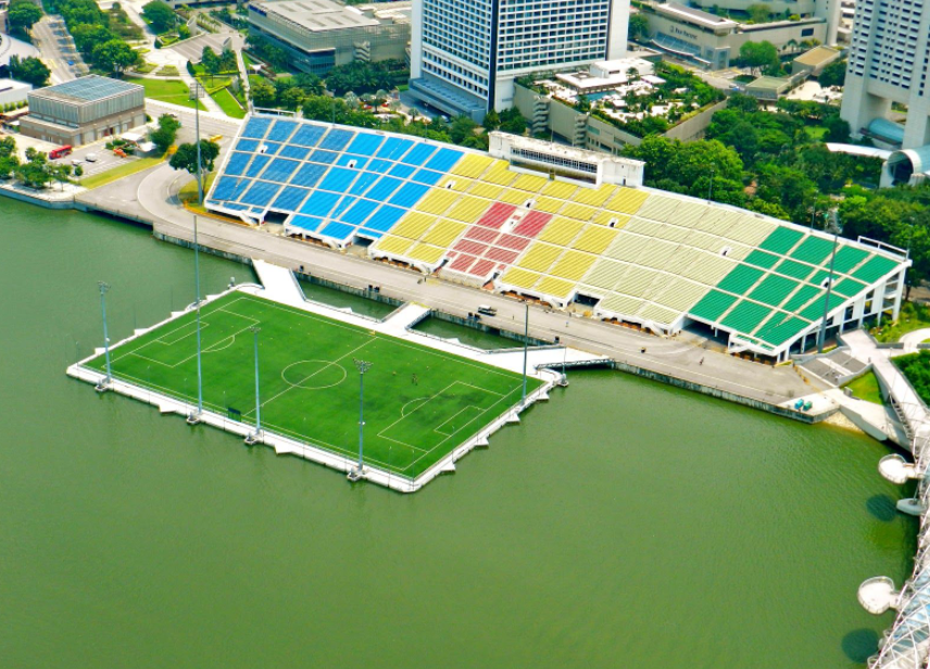 1. Estádio Marina Bay de Cingapura: foi construído no meio do mar. O campo está ligado à terra por uma plataforma e tem capacidade para 30.000 pessoas sentadinhas na arquibancada que fica em terra firme. Foi inaugurado em 2007.